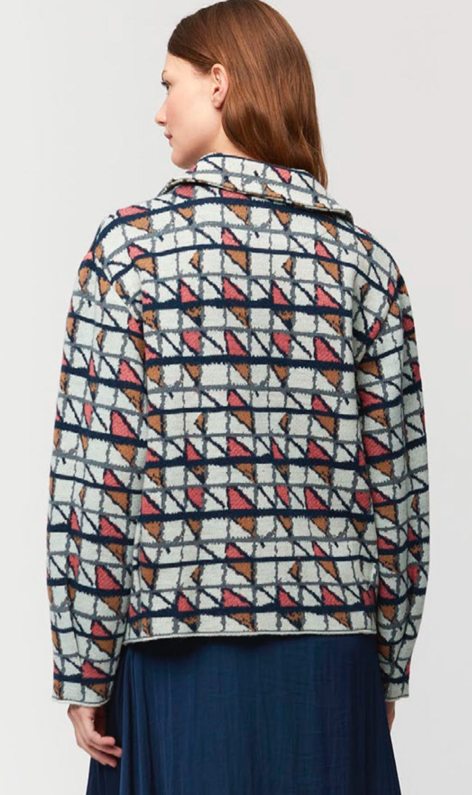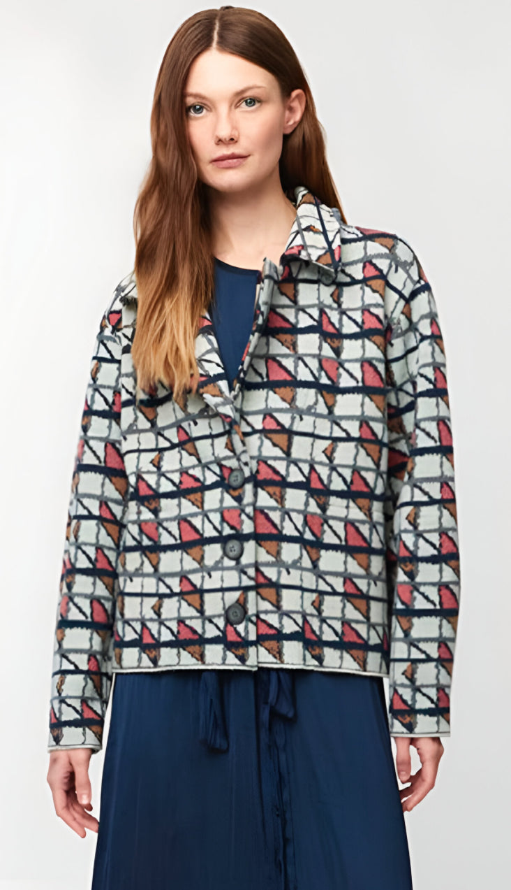 Abrigo corto confeccionado en punto con estampado geométrico en tonos turquesa, terracota y coral. Corte recto y silueta relajada.