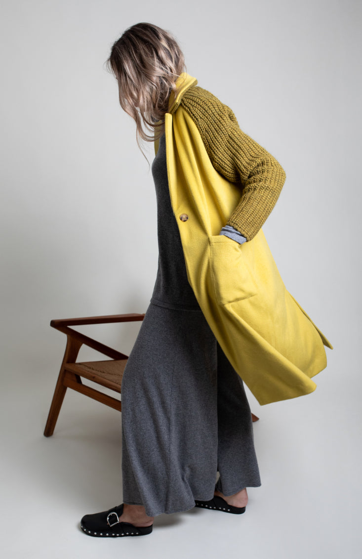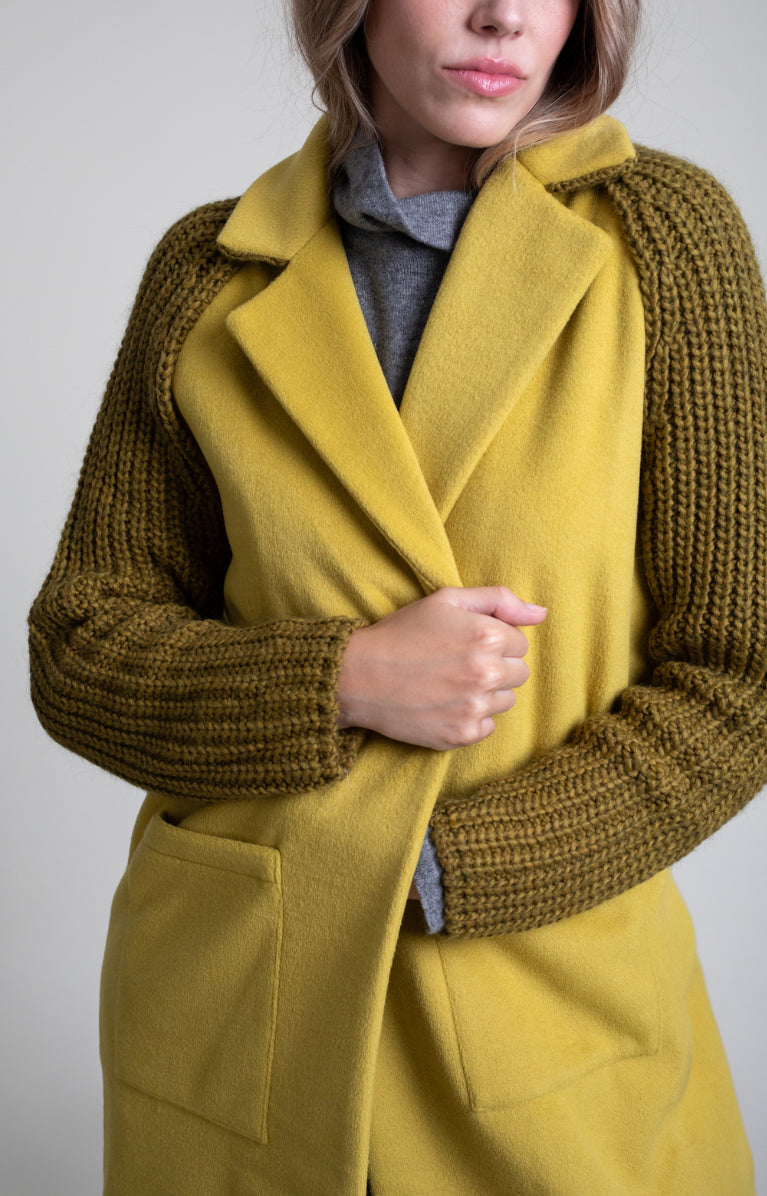 Abrigo de paño lima combinado con punto. Modelo de corte ligeramente oversize con cuello solapa y manga ranglan en punto. Cierre frontal con botón y bolsillos en delantero.